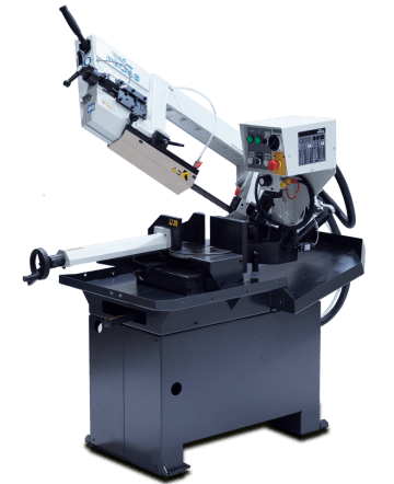 Pracovní pohyb ramene zajištěn vlastní hmotnosti ramene, pozice ramene je definována hydraulickým válcem. Škrtící ventil pro regulaci rychlosti řezného posuvu. Po dokončení řezu v dolní poloze se pohyb pilového pásu automaticky vypne. Zdvihnutí ramene provádí obsluha manuálně. Manuální upnutí a uvolnění materiálu. Obsluha manuálně zakládá, posouvá a odebírá materiál.