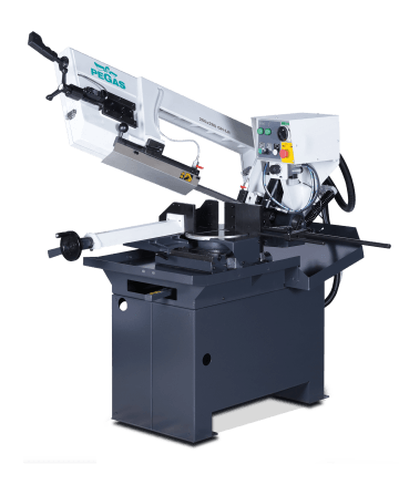 Pracovní pohyb ramene zajištěn vlastní hmotnosti ramene, pozice ramene je definována hydraulickým válcem. Škrtící ventil pro regulaci rychlosti řezného posuvu. Po dokončení řezu v dolní poloze se pohyb pilového pásu automaticky vypne. Zdvihnutí ramene provádí obsluha manuálně. Manuální upnutí a uvolnění materiálu. Obsluha manuálně zakládá, posouvá a odebírá materiál.