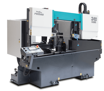 - Vysoce produktivní automatická dvousloupová pásová pila s vícenásobným podáváním materiálu.