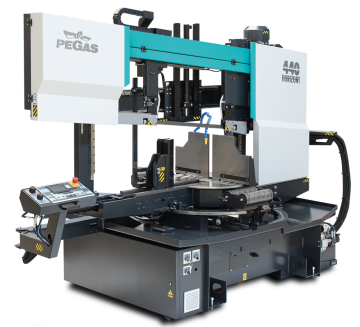 - Vysoce produktivní, poloautomatická dvousloupová pásová pila.