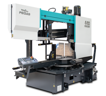 - Vysoce produktivní, poloautomatická dvousloupová pásová pila.