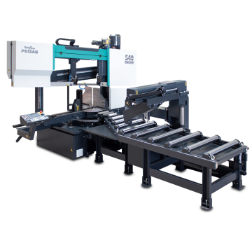 - Vysoce produktivní, automatická dvousloupová pásová pila s vícenásobným podáváním materiálu.