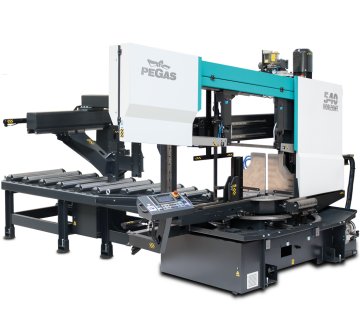 - Vysoce produktivní, automatická dvousloupová pásová pila s vícenásobným podáváním materiálu.